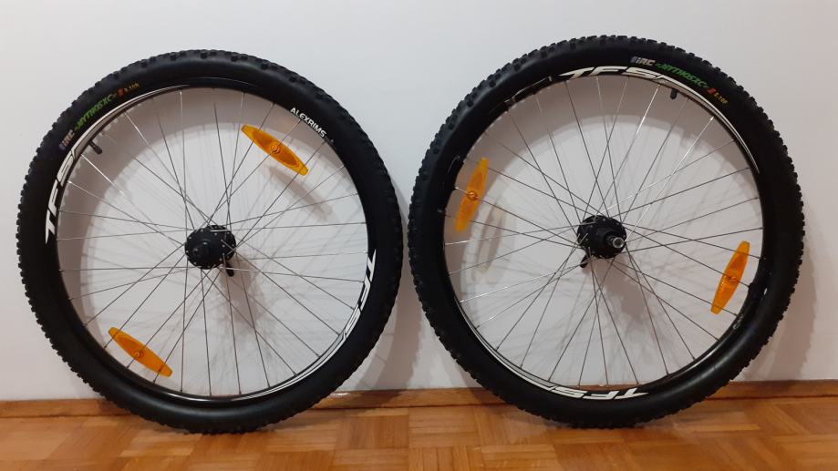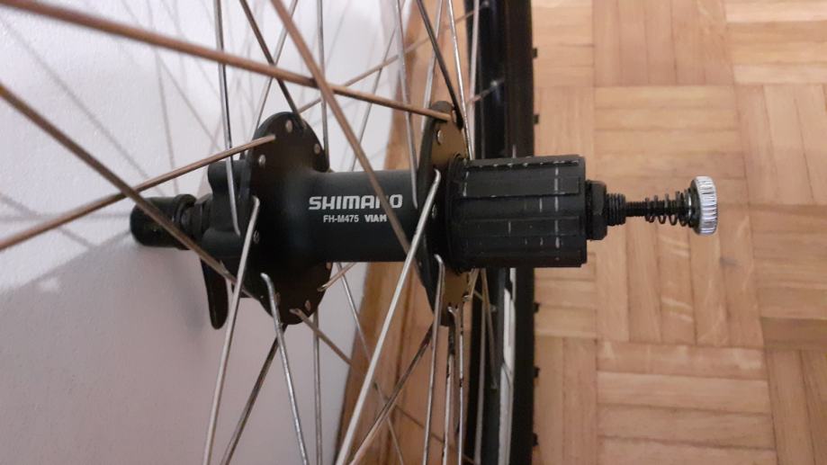 - stražnji kotač OŠTEĆEN OBRUČ (pogledati fotografije), Shimano FH-M475 naba (ispravna), 32 žbice, vanjska guma IRC 2.10R Mythos XC II