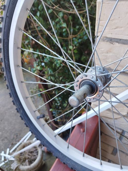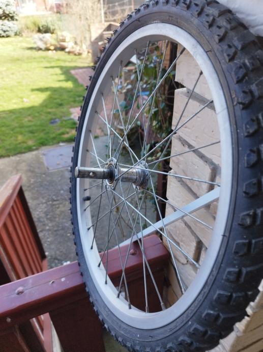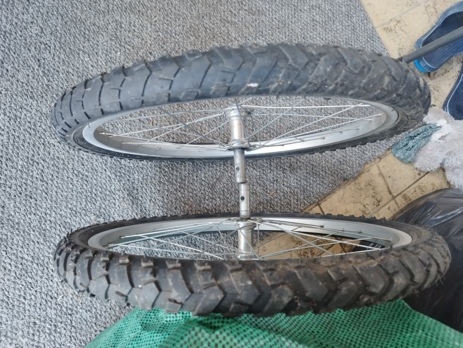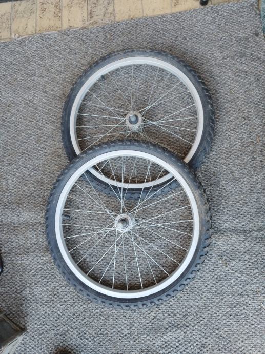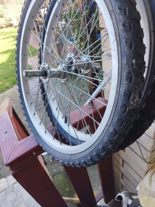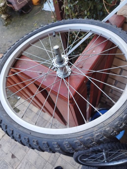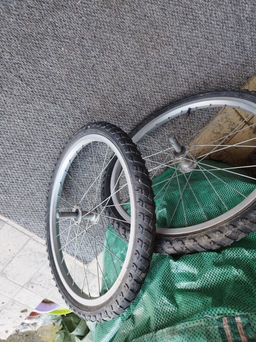 Kotači s aluminijskim fegama ,pripadajučim osovinama u izvrsnom stanju.Pogodni za lake prikolice(do 50kg nosivosti)za bicikle ili ručno guranje.Isključivo kao par tako da je i cijena za oba kotača.