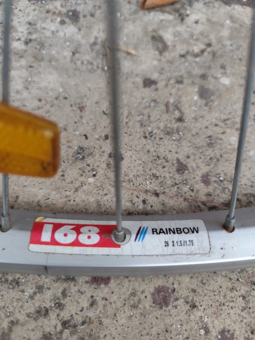 Prodajem rabljeni prednji kotač za bicikl promjera 26 inča s aluminijskom felgom Rainbow. Kotač je korišten ali još uvijek funkcionalan, s dobrim žbicama i originalnom osovinom. Za gume 1.5/ 1.75