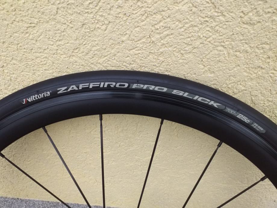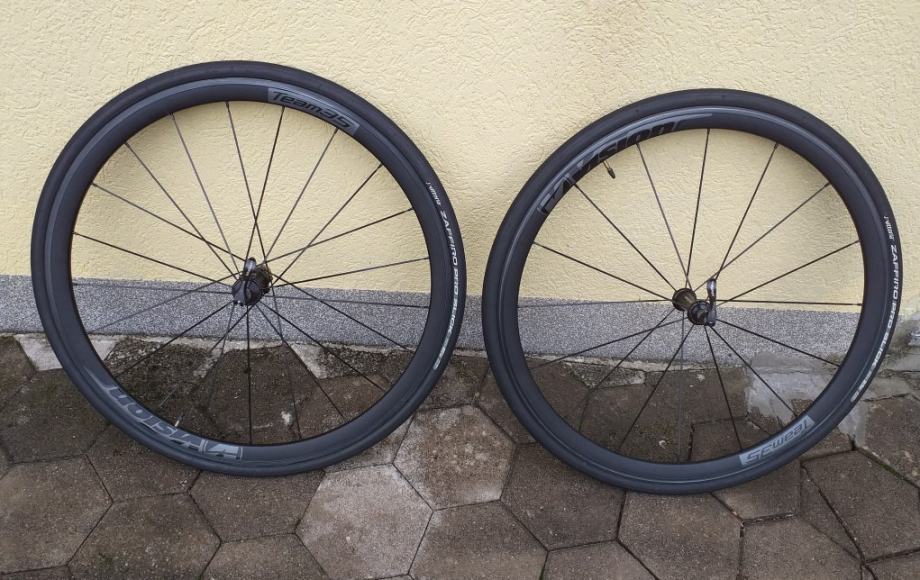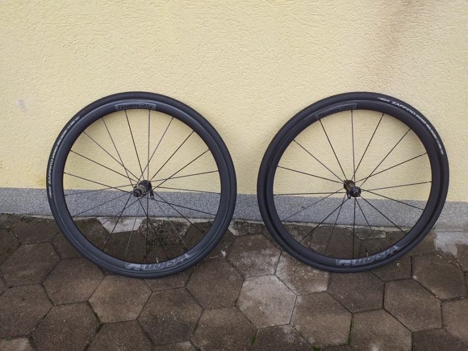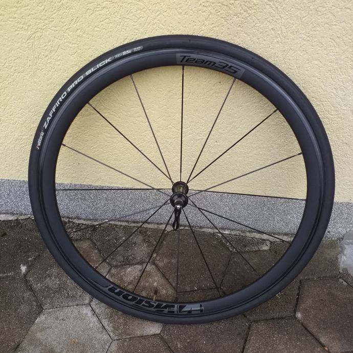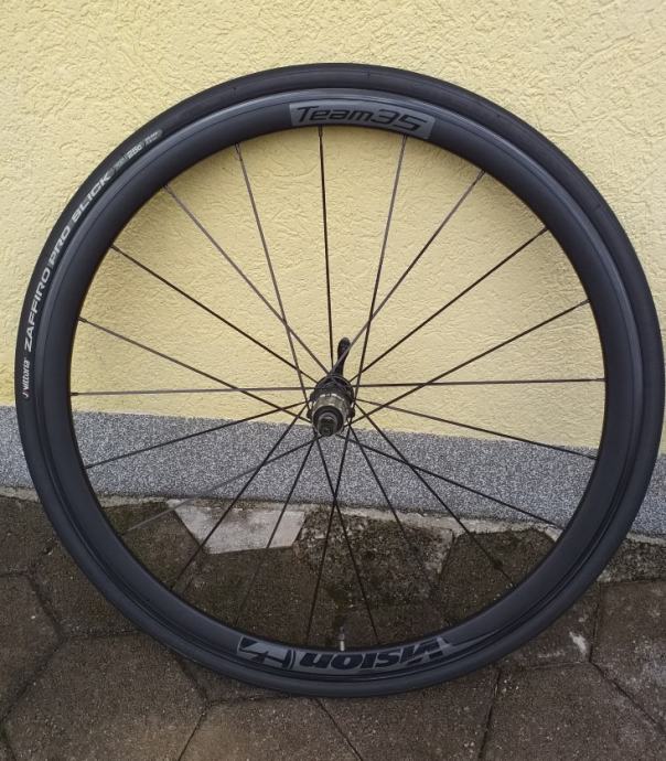 Cestovni kotači Vision Team 35, voženi sezonu i pol, sa malo rabljenim gumama Vittoria Zaffiro Pro Slick, zračnicama i kočionim paknama Shimano R55C4, nigdje oštećeni i potpuno ispravni, poklanjam dvije nove i nekorištene zračnice, prodaja zbog prelaska na karbonske kotače.
