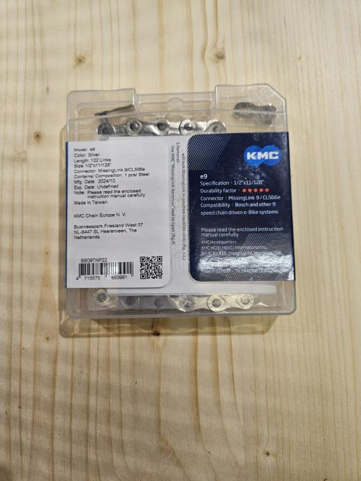 KMC e9 ojačan lanac sa 122 karike, posebno izrađen za električne bicikle s 9 brzina, sa brzom spojnicom.