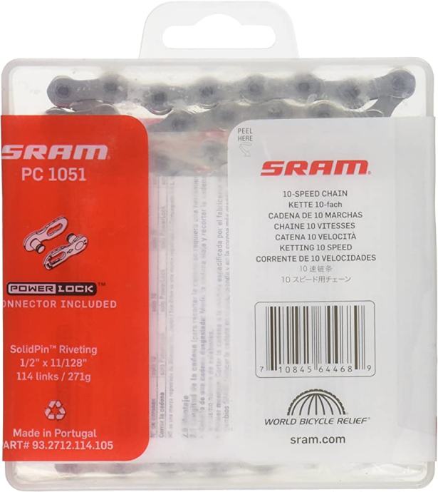 Nov SRAM PC-1051 PowerChain 10-brzinski lanac u originalnom pakiranju, kompatibilan sa svim uobičajenim 10-brzinskim sustavima (SRAM, Shimano itd.). Uključuje PowerLock kariku za lako spajanje lanca bez alata.