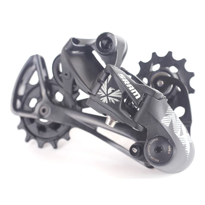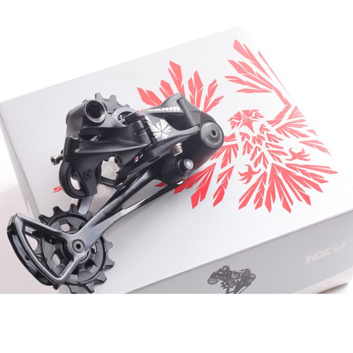 Nov SRAM NX Eagle stražnji mjenjač za bicikl, za kazete s 12 brzina odnosno 1x12 pogone, neotvoren u originalnom pakiranju (na slikama je otvoren drugi primjerak). Namijenjen brdskim (MTB) biciklima. Stabilizator lanca Roller Bearing Clutch Type 3.0 održava zategnutost lanca i time osigurava pouzdano mijenjanje brzina i pri vožnji grubim terenom, pri čemu pripadna spojka ne zahtijeva posebno održavanje. Cage Lock mehanizam omogućava blokiranje mjenjača u položaju u kojem je lanac potpuno labav, čime znatno olakšava skidanje odnosno postavljanje kotača te zamjenu lanca.