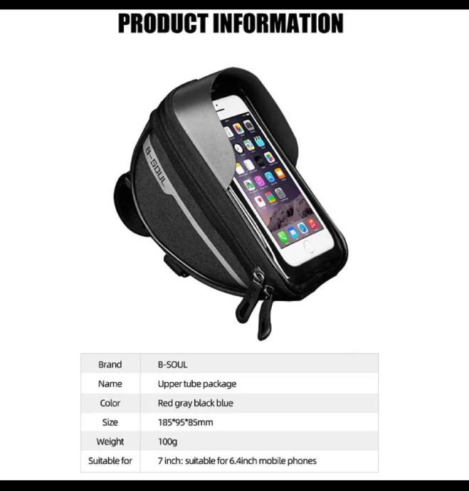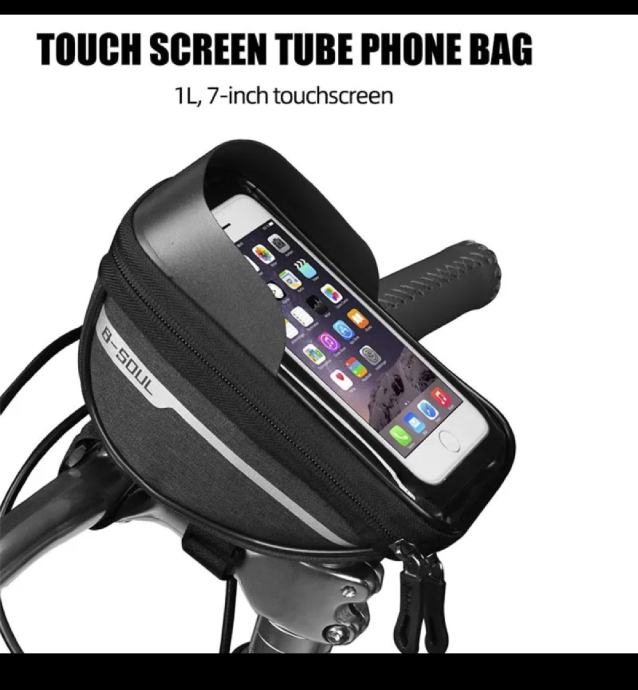 Torba za bicikl( zapremine 1 litar, dimenzija: 185x95x85 mm, napravljena od čvrstog materijala( polyester with TPU touch screen film), waterproof IP65 dostatna za telefone do 6.4 inch čiji je displej apsolutno zaštićen tijekom vožnje od vode ,prašine i grebanja!