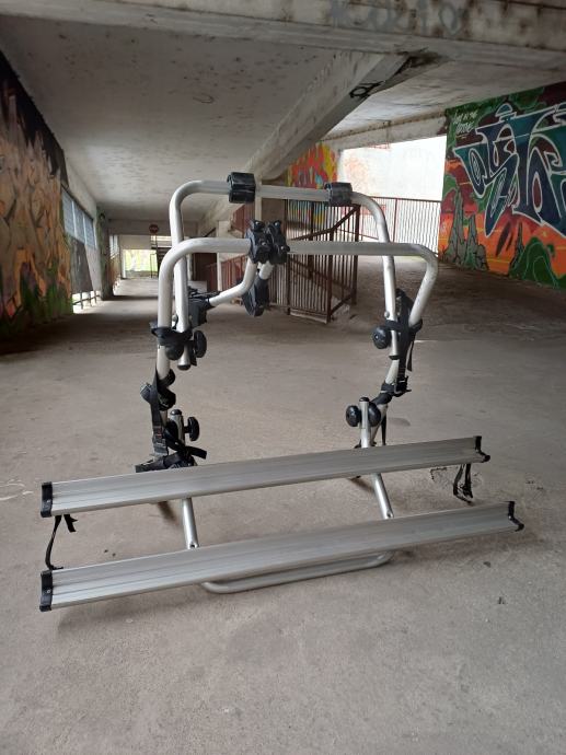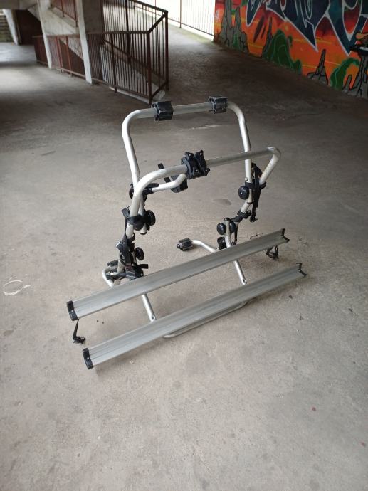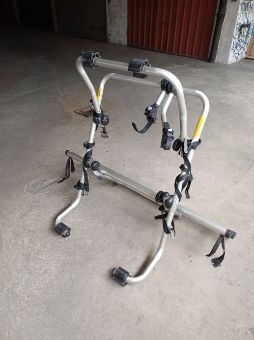 Prodajem rabljeni stražnji nosač za bicikle koji se montira na stražnji dio vozila. Nosač je izrađen od aluminijskih cijevi u srebrnoj boji s plastičnim i metalnim stezaljkama te remenim pričvršćivačima. Konstrukcija omogućuje prijevoz dva bicikla, a zahvaljujući sklopivom dizajnu relativno je kompaktan za skladištenje kada nije u upotrebi.