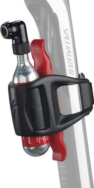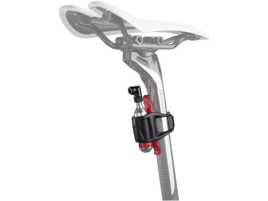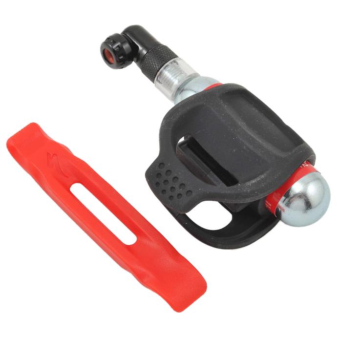 Everything needed to fix a flat on a standard size mountain or high-pressure road tire, housed in a compact package that fits conveniently on the seatpost.