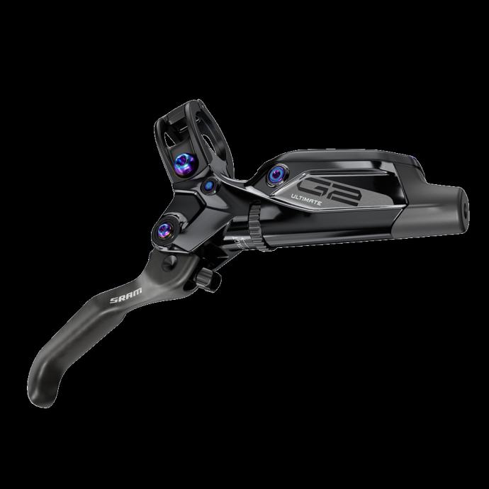 Disc Brake G2 Ultimate, Carbon Lever, Rainbow Hardware, Reach, SwingLink, Contact, Gloss Black Front 950mm Hose (includes MMX Clamp, Rotor/Bracket sold separately) A2 Platform: G2Color: Gloss Black w/Rainbow HardwareOrientation: FrontBrake type: HydraulicApplication: MTBBlade material: CarbonContact adjust: YesRecommended MMX clamp: Titanium bolt, blk clmpHose length: 950mmPad type: Steel-backed organicBracket: Direct mount DIRReach adjust: Tool-freeRecommended discrete clamp: Hinge - Steel - gloss blackPistons: 4Piston material: Phenolic PlasticHose routing angle: Adjustable banjoCaliper body material: Forged AluminumCaliper hardware: TitaniumCaliper construction: 2-pieceHydraulic fluid: DOT 5.1Lever pivot: BearingLever body material: Forged AluminumRotor type recommended: 1-piece CenterLineGPSR contact in the EU: SRAM Europe, Paasbosweg 14–16, 6862 ZS Nijkerk, Netherlands, e-mail: compliance@sram.com | www.sram.com