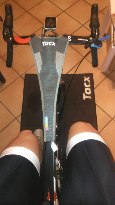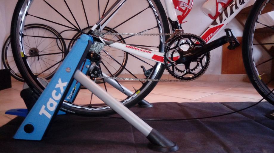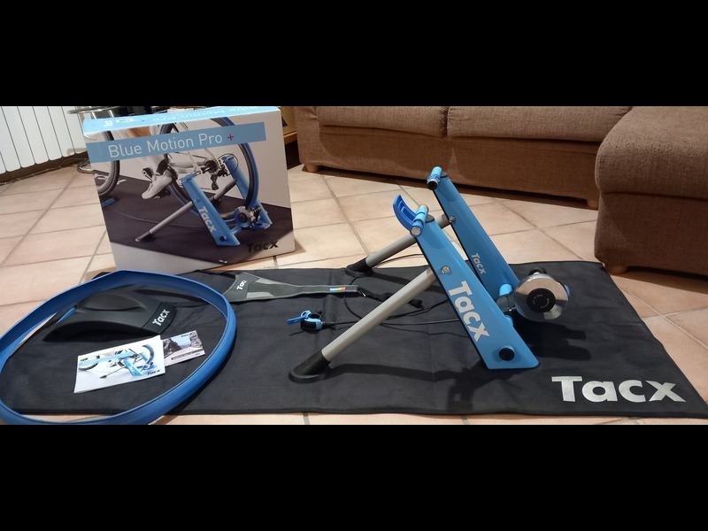 Trenažer TACX Blue Motion Pro + u izvrsnom stanju. Originalna, kartonska ambalaža. Vrlo tih, tacx tepih (zvučna izolacija), zaštita za gornji dio bicikla, posebna guma za trenažer u izvrsnom, nekorištenom stanju. Tacx adapter za prednji kotač.
