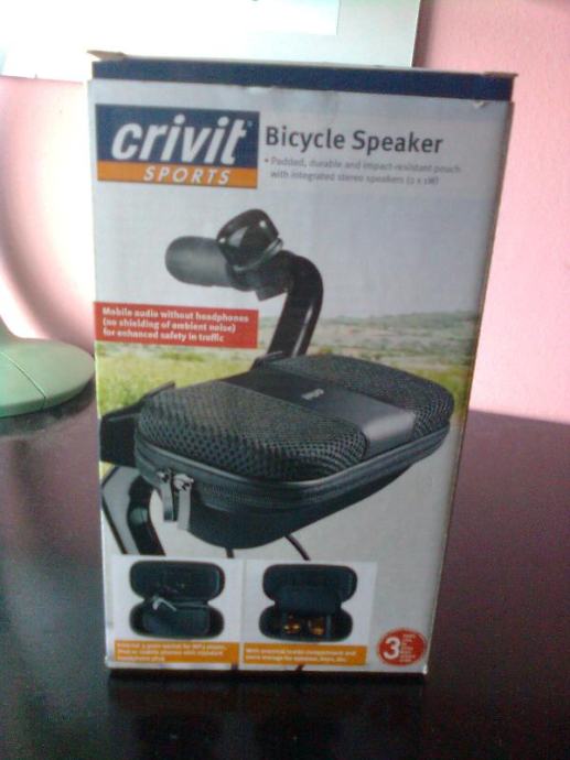 Prodajem zvučnike za bicikl, marke CRIVIT, to je postavljena, izdržljiva torba, sa stereo-zvučnicima (2×1 W), unutra se nalazi 3,5 mm utikač za MP3, iPOD ili mobitel sa standarnim priključkom za slušalice, praktični unutarnji pretinac za pospremanje naočala, ključeva itd, uključujući 3×AAA baterije...
