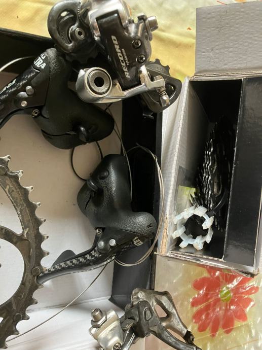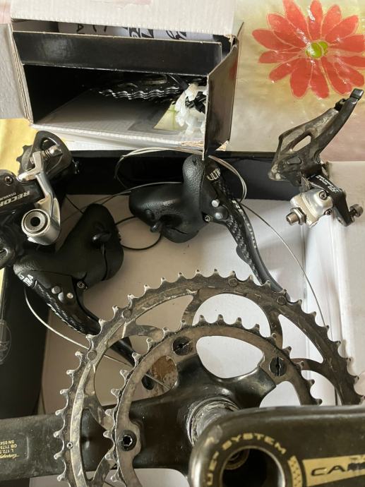 Prodajem ispravnu i u dobrom stanju grupu Campagnolo record 10: Pogon compact, 2 šamaraljke, mjenjač prednji i zadnji i kaseta 12-30, Roba može biti poslana iz RH. U kompletu idu dva zadnja mjenjača, jedan je poklon za dijelove, fali mu samo b-šaraf.