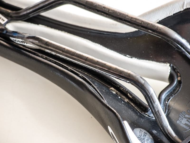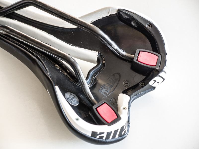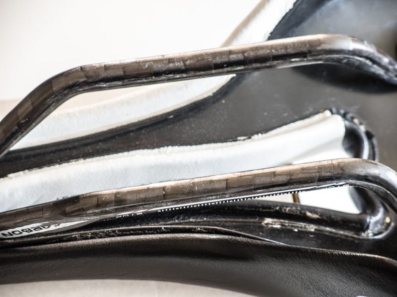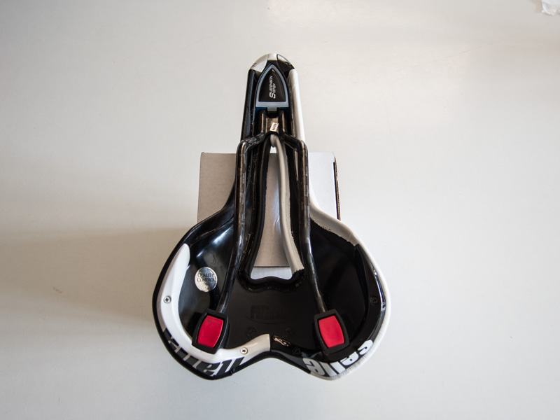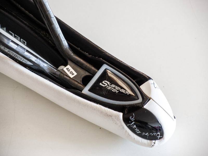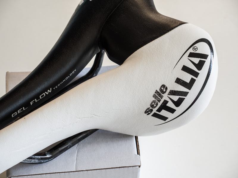 • Turbomatic Team Edition saddle is black and white with a synthetic leather (Lorica) upper and carbon rails.