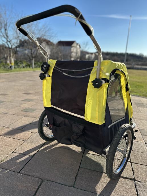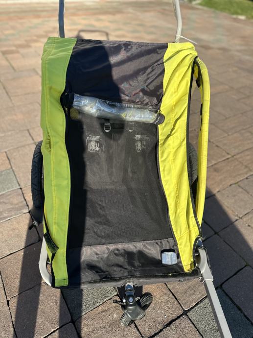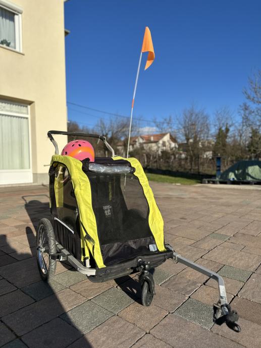 Korištena, u dobrom stanju. Jedan dio materijala treba zašiti. Dolazi navlaka za kišu. Prikolica je za dvoje djece. Kaciga uz kupnju.