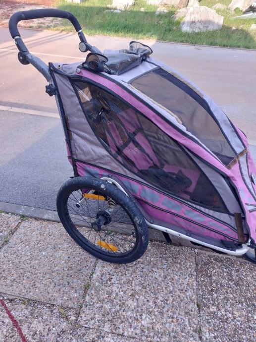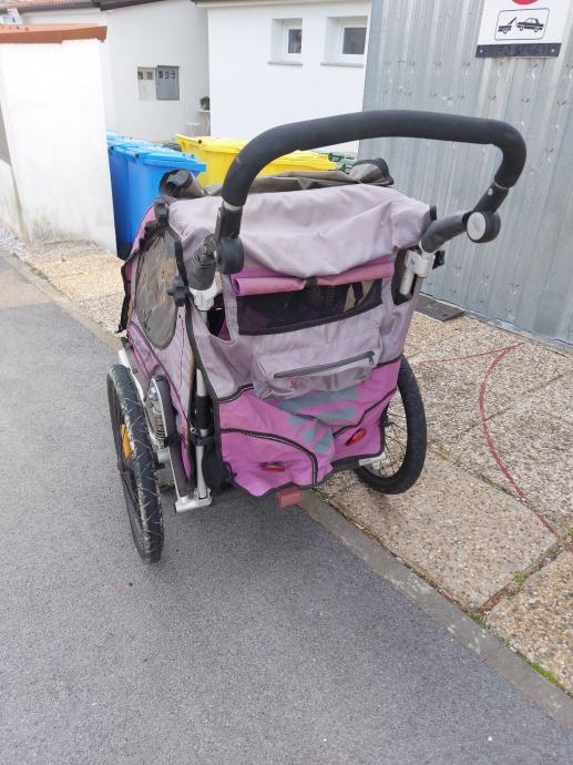 Prodajem odlicnu prikolicu za prijevoz dijeteta sa biciklom koji ima i amortizere. Moze se pomocu prednjeg kotaca koristiti kao sportska dijecija kolica.