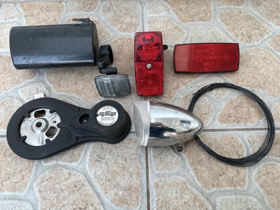 komplet svjetla na dinamo za klasične bicikle, njemačke proizvodnje, dinamo FER s ležajevima (montaža na prednju osovinu), prednje svjetlo Union, stražnje svjetlo, žica za svjetla, katadiopteri prednji i stražnji veliki za paket-sic, torbica za alat, sve ispravno u vrlo dobrom stanju, prodajem sve za 10€ (ne pojedinačno), moguće slanje (+3€) ili dostava do ZG