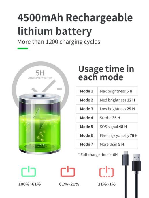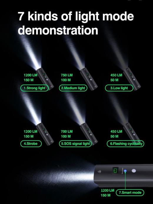 Modovi: 1200 lm - 750 lm - 450 lm, 3 moda bljeskalice i smart mode