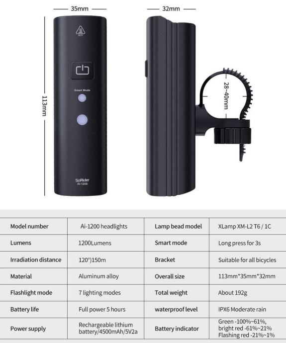 Svjetiljka ima ugrađeni senzor svjetla (ne svijetli pri razini svjetlosti većoj od 100 luxa, a čim padne ispod 100 luxa svjetli konstantno snagom 1200 lm) i senzor pokreta (kada bicikl miruje 120+ sekundi, svjetlo se automatski gasi, a pri prvom pokretu se ponovno pali).
