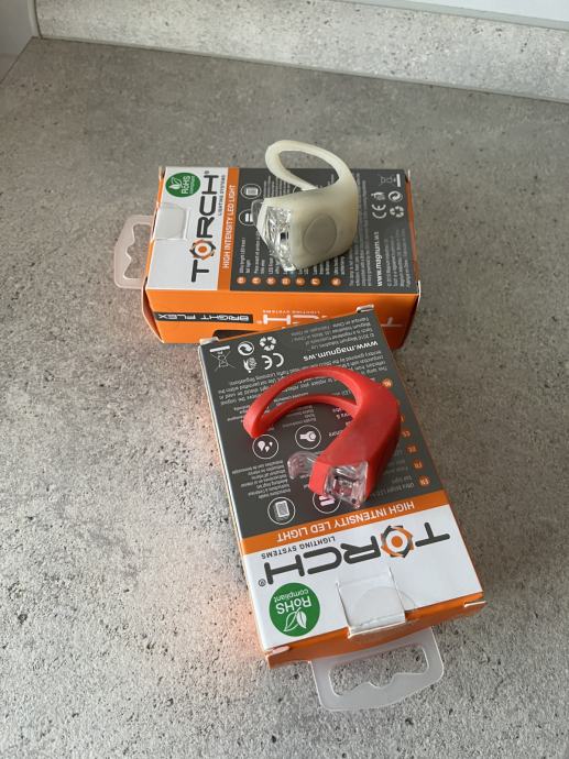 Svjetla imaju tri načina rada: Stalno svijetli, brzo treperi i sporo treperi. Korišteno cca. 10 dana. Oba u kompletu.