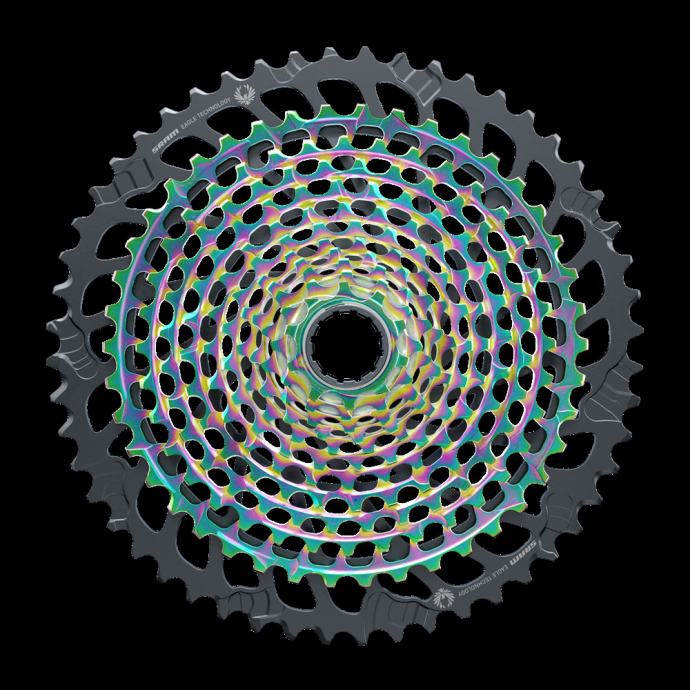 Cassette XG-1299 Eagle 10-52 12 speed Rainbow Platform: XG-1299Chain: EagleSpeed: 12Gearing: 10-52tCog finish: RainbowTechnology: XGCog sizes: 10-52t:10,12,14,16,18,21,24,28,32,36,42,52Driver body type: XDGPSR contact in the EU: SRAM Europe, Paasbosweg 14–16, 6862 ZS Nijkerk, Netherlands, e-mail: compliance@sram.com | www.sram.com