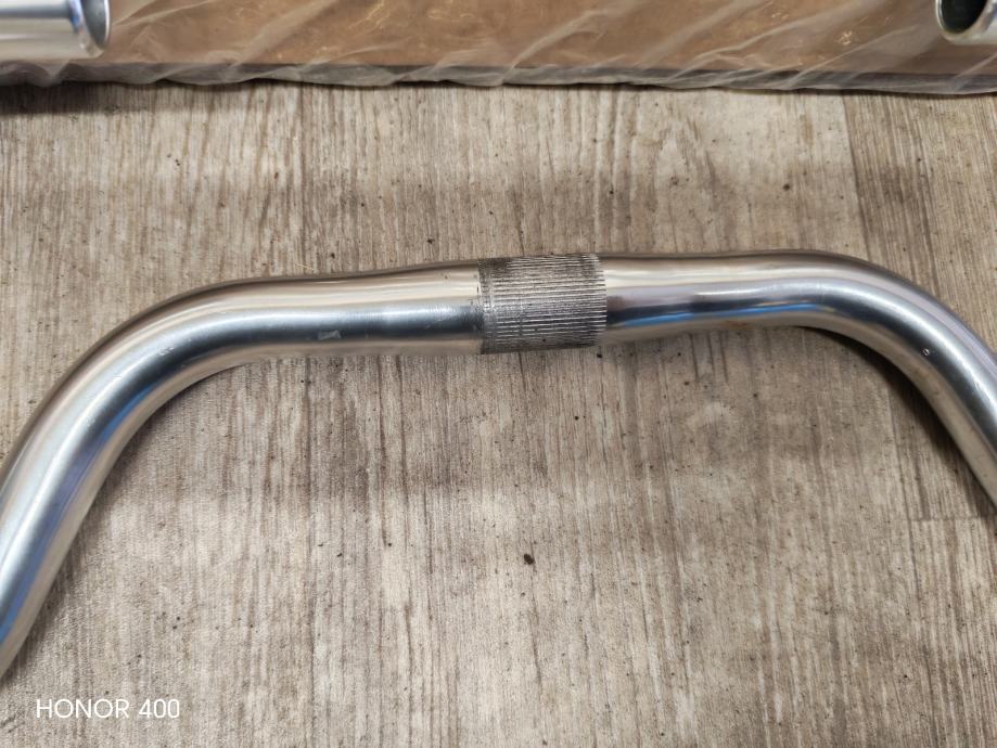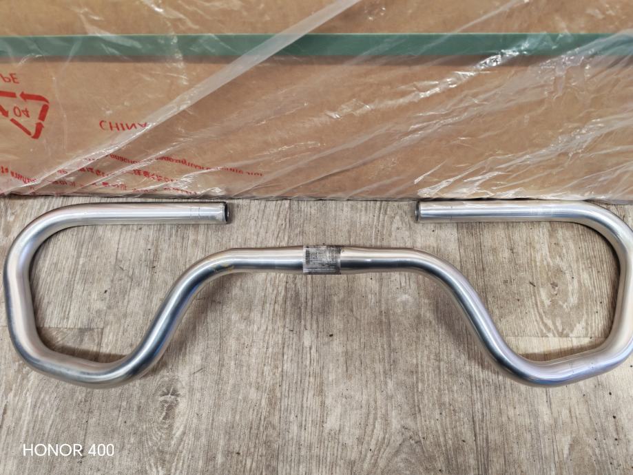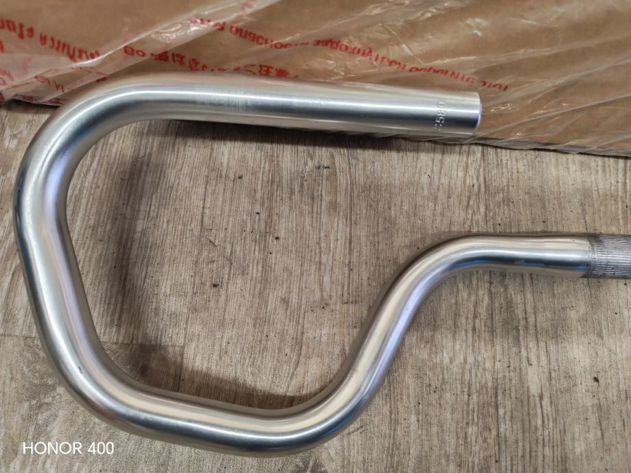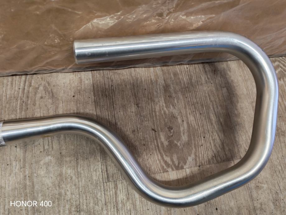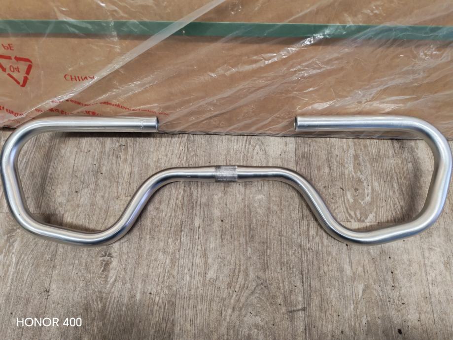 Prodajem rabljeni volan za bicikl srebrne boje, izrađen od aluminija. Radi se o volanu karakterističnog valovitog oblika s ravnim hvatištima na krajevima, kakav se često koristi na gradskim i klasičnim biciklima. Na sredini volana nalazi se narebreni prsten za stezanje uz lulu volana.