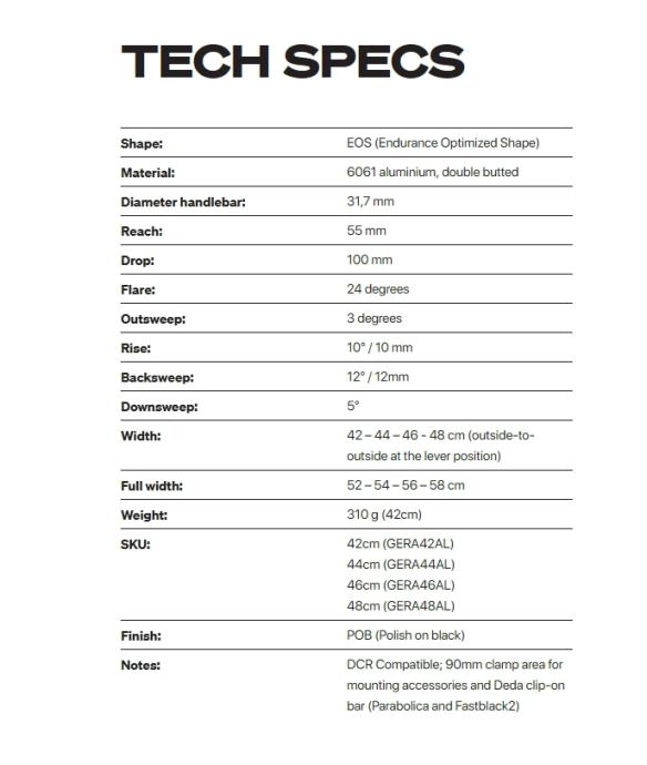 Gera® Alloy is made from 6061 aluminium using an innovative mechanical forming process that allows manufacturing a complex design such as Gera. It is the perfect choice for any gravel & adventure bike set-up. Multiple hands positions at the rider disposal to always find the best grip and position on gravel roads. The handlebar features a 10° backsweep angle and 5° downsweep for a more comfortable set-up for long distance bikepacking. A 10mm rise is an additional help to get the desired handlebar stack height. The 24° flare and 3° outsweep at the drops offers a superior stability when you are riding a challenging terrain. Reach and drop have been optimized in the EOS shape (Endurance Optimized Shape). The 55mm reach allows a closer position of brake levers while the 100mm compact drop is for more comfort and fast transition from lever to bar-end. With Gera Alloy you have a 90mm wide center area to install any accessory and clip-on bar extensions. Handlebar is available in 4 different sizes, 42, 44, 46 and 48.