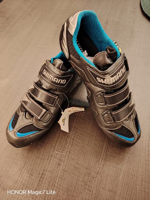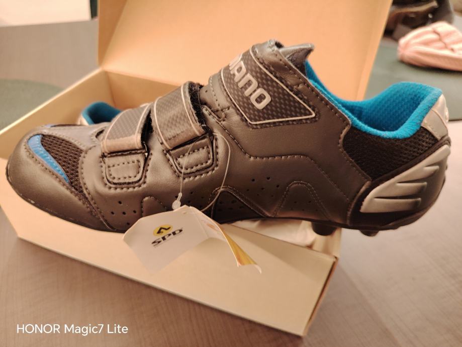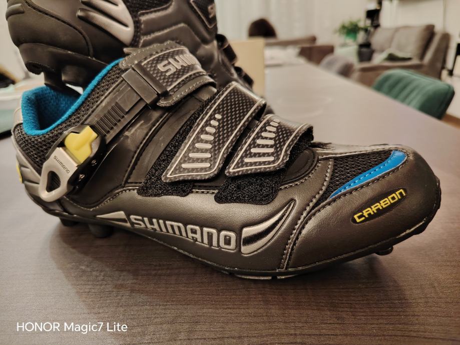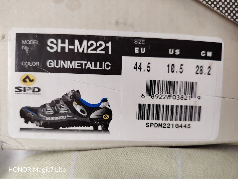 Shimano biciklističke tenisice, model SH-M221, veličina 44.5. Boja je gunmetallic s plavim detaljima. Tenisice su opremljene sustavom s tri čičak trake za jednostavno zatvaranje i prilagodbu, a imaju Carbon oznaku što ukazuje na učinkovit prijenos snage. Kompatibilne su s SPD sustavom pedala.