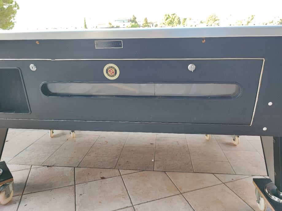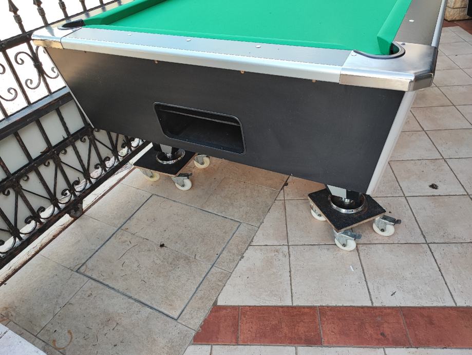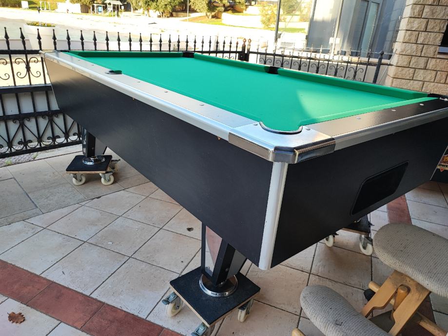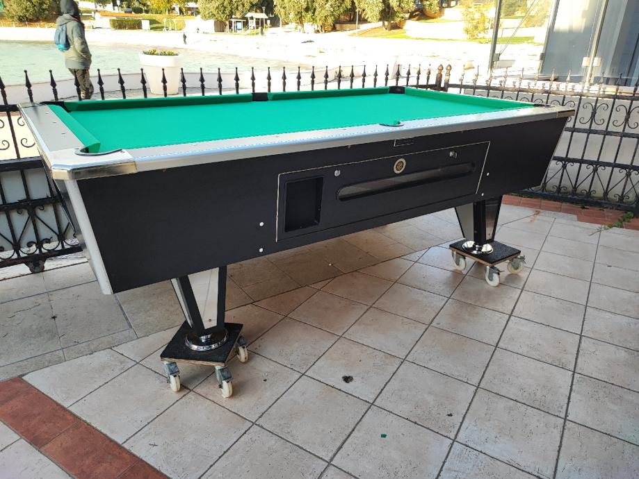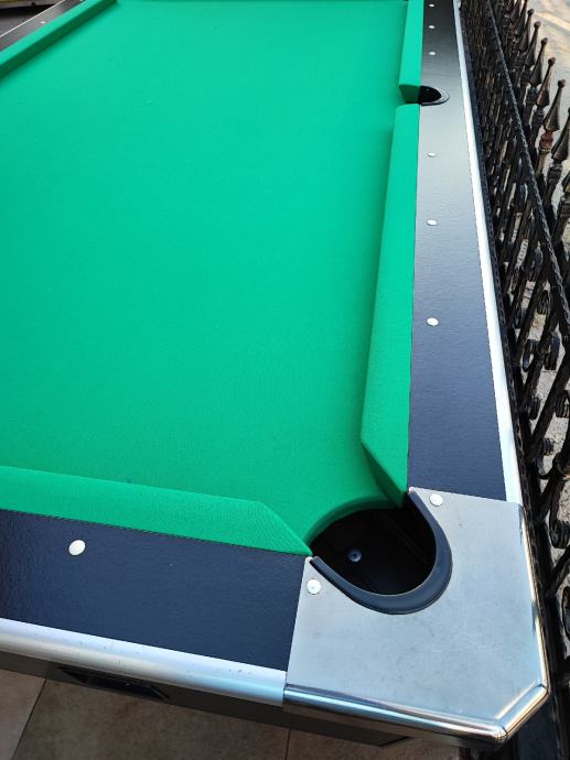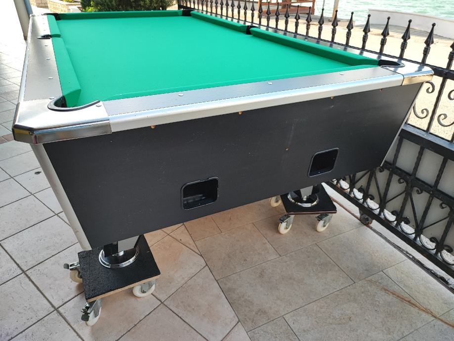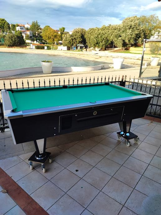 Crni , izvrsno stanje , novo platno. Uz bilijar idu kugle , 2 stapa trokut i kiks. Namjesten je na slobodnu igru a po potrebi moze i sa žetonjerom na eure.