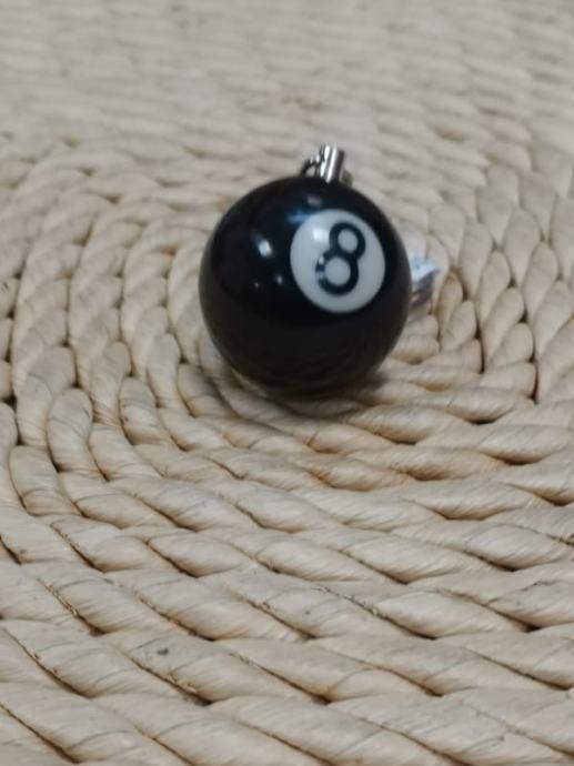Privjesak biljarska kugla br. 8. Kugla izrađena od istog materijala kao i prava biljarska kugla! Dužina privjeska 8, 5 cm, promjer kugle 35 mm.