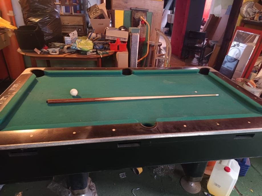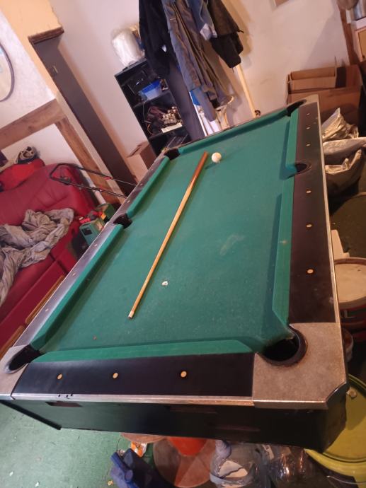 Profesionalni biljar s punom opremom (sve kuglice i stap). Rabljen ali u odlicnom stanju. Bravu za vadjenje zetona treba promijeniti. Dimenzije: duzina 210 x sirina 123 x visina 80 cm.