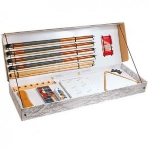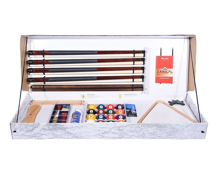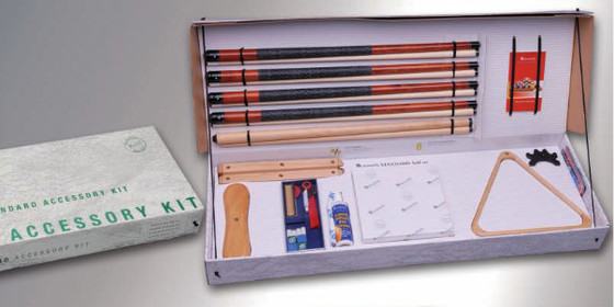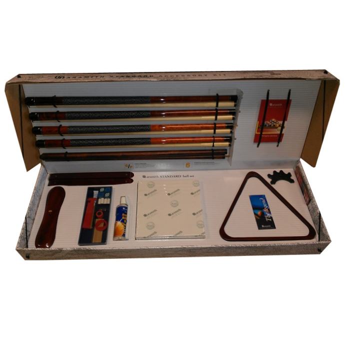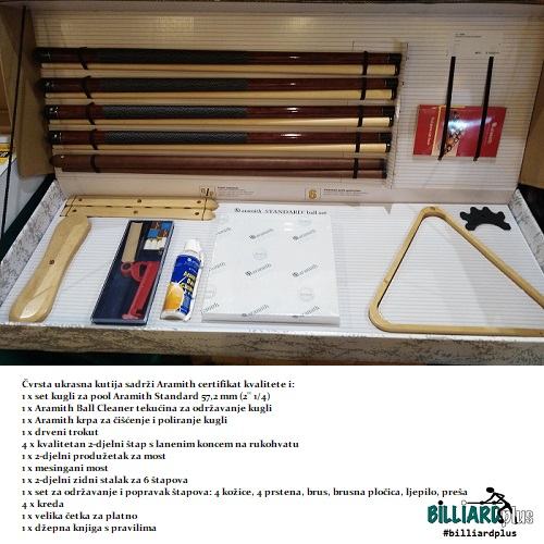Čvrsta ukrasna kutija sadrži certifikat i kompletan pribor za biljarski stol: