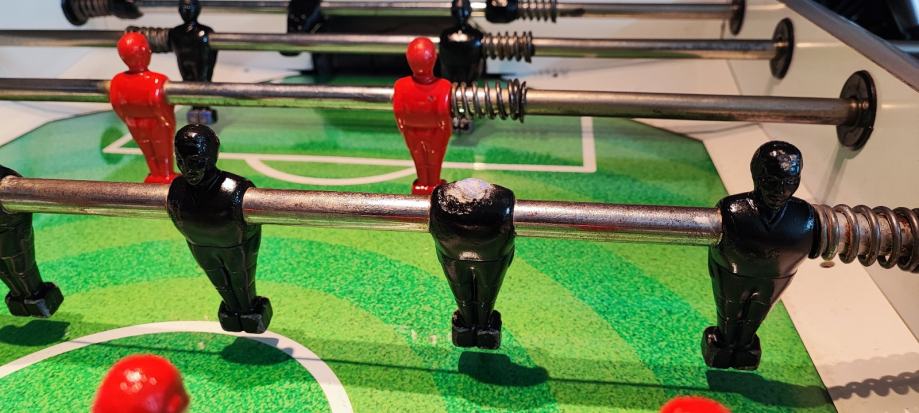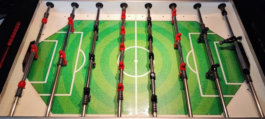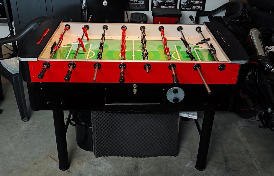 Stol je kvalitetne izrade s metalnim nogama i čvrstom konstrukcijom. Teži oko 80kg i ne mrda čak ni prilikom agresivnog igranja. Ima crvene i crne igrače (jednom je glava odletila prilikom žustre borbe), zelenu igraču površinu s obilježenim terenom, te brojače golova s obje strane. Prije 3 godine kompletno je uređen i pofarban, zamijenjen je teren i ispolirane su šipke i staklo. Mehanizam funkcionira i posjedujem vrećicu punu žetona. Jedino što treba napraviti je zamijeniti pante jer je jedna panta (od dvije) pukla što ne smeta prilikom igranja, kad se gornji dio spusti i zaključa ne miče se. Stol je pogodan za rekreativno igranje a može se koristiti i u ugostiteljstvu. Cijena ovog stola novog u dućanu iznosi oko 1200€. Imajte na umu da se stol ne može rastaviti tako da Vam je potrebno veće vozilo za transport.