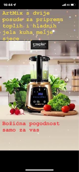 Prodajem potpuno novi ARTMIX PRO ZEPTER blender, idealan za pripremu zdravih obroka. Profesionalni kuhinjski aparat s naprednim funkcijama koji štedi vrijeme i trud u kuhinji.