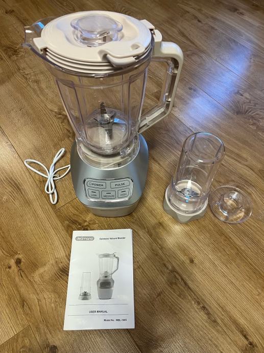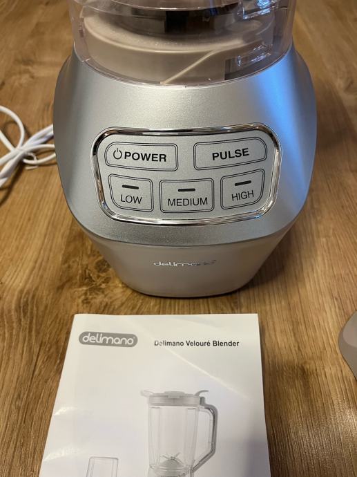 Prodajem Delimano Veloure blender u srebrnoj boji. Blender dolazi sa staklenom posudom većeg kapaciteta, dodatnom manjom posudom za mljevenje, te poklopcem s otvorom za dodavanje sastojaka. Ima elektroničke tipke za upravljanje: POWER, PULSE, te tri razine brzine (LOW, MEDIUM, HIGH). Uključen je i priručnik s uputama za korištenje. Blender je u ispravnom stanju i potpuno funkcionalan.