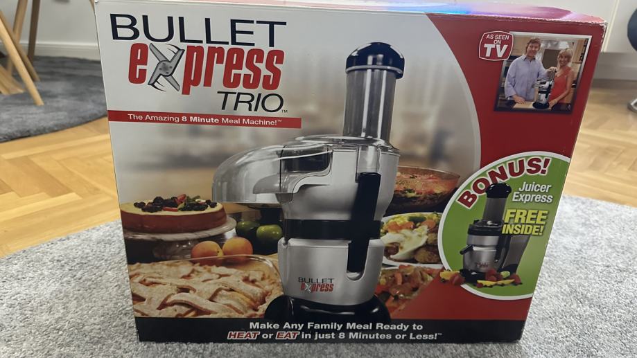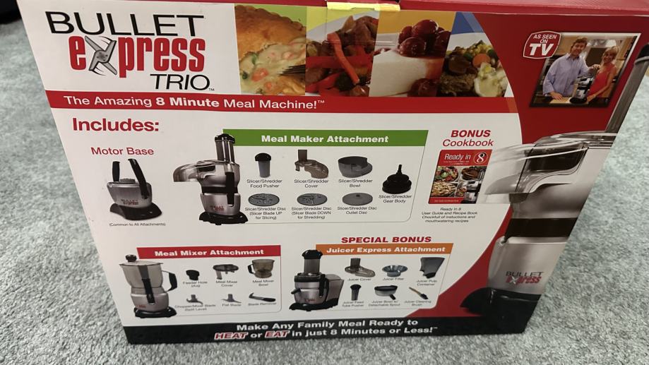 Prodajemo NOVI zapakirani Bullet Express Trio, koji uključuje Meal Maker dodatak, Meal Mixer dodatak i Juicer Express dodatak.