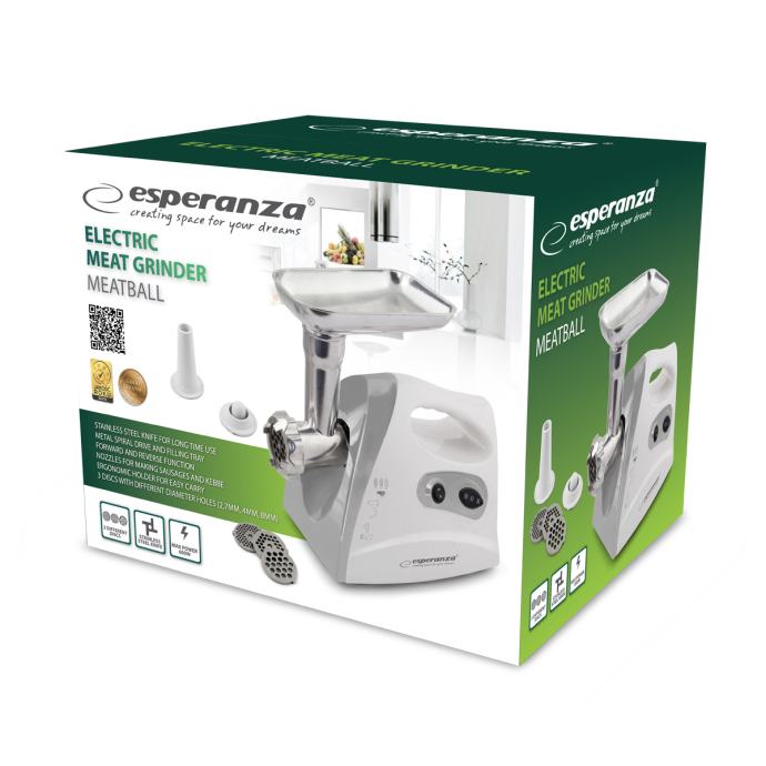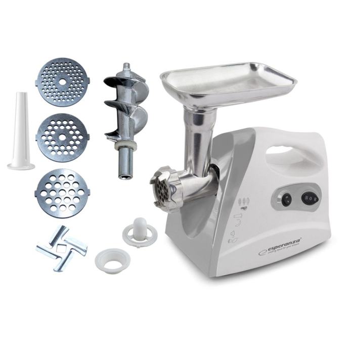 Aparat za mljevenje mesa ESPERANZA moderan je i funkcionalan uređaj koji bi se trebao koristiti u svakoj kuhinji. Tri diska s rupama različitog promjera (2,7 mm, 4 mm, 8 mm) mljeve ne samo meso, već i druge namirnice. Uređaj je opremljen motorom od 600 W koji osigurava brzo i učinkovito korištenje proizvoda. Neklizajuća gumena stopala osiguravaju stabilan i siguran rad.