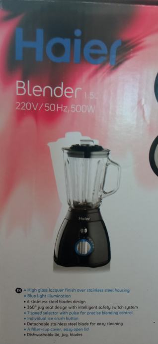 Blender od nehrđajućeg čelika + super motor, indikacija razine plavog svijetla staklena posuda od 1.5 l , drobilica za led, sa šest ostrica od nehrđajučeg celika, baza koja se okreće za 360 stupnjeva,zaštitni uredaj, podešavanje u 7 razina, tocna brzina mijesanja, oštrice koje se skidaju i lako peru , piano crna boja .
