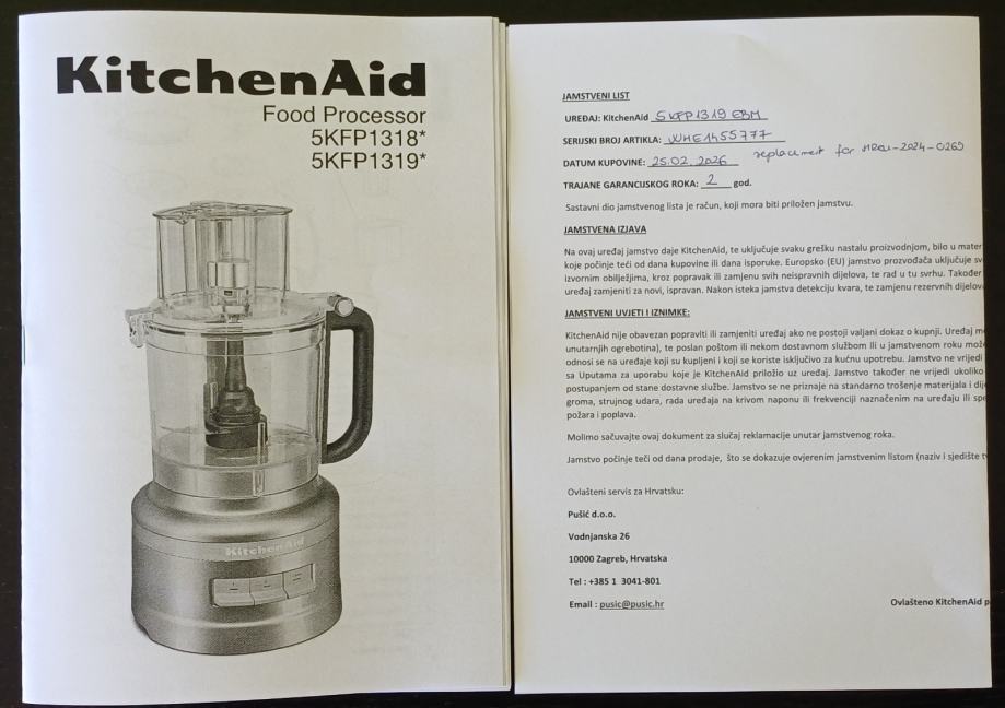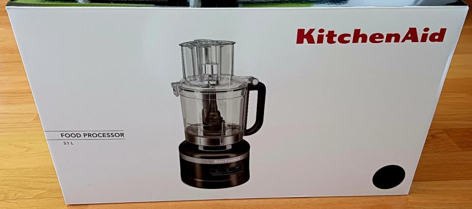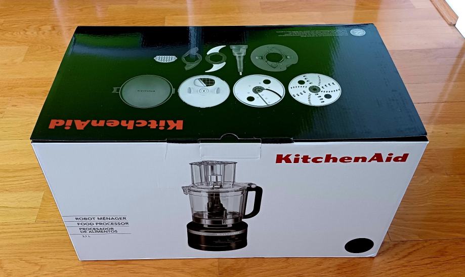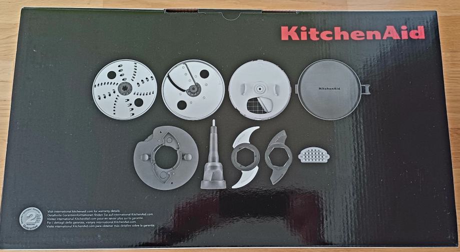 Prodajem novi KitchenAid multipraktik s posudom od 3,1 litre. Aparat je crne boje i dolazi s nizom nastavaka za različite namjene u kuhinji – diskovi za ribanje i rezanje, nož za sjeckanje te ostali dodaci koje možete vidjeti na fotografijama.