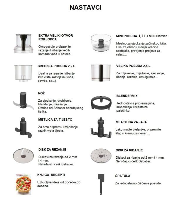 Kutija za pribor: Mini oštrica, Glavna oštrica, Mlatilica za jaja, Metlica za tijesto, 2 mm disk za rezanje, 2 mm disk za ribanje, 4 mm disk za rezanje, 4 mm disk za ribanje, špatula.