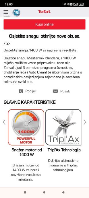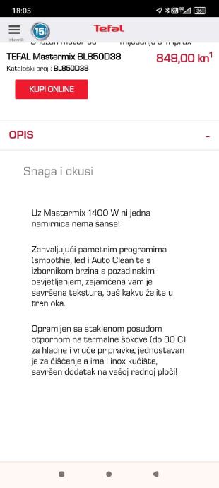 Prodajem blender TEFAL Mastermix BL850D38 u odličnom stanju. Vrlo malo korišten, bez oštećenja i potpuno funkcionalan. Ima snažan motor od 1400 W, kapacitet posude od 2 L i oštrice od nehrđajućeg čelika koje omogućuju brzo blendanje i drobljenje leda. Idealno za pripremu smoothija, juha, umaka i drugih jela. Dolazi sa svim originalnim dijelovima i uputama za upotrebu.