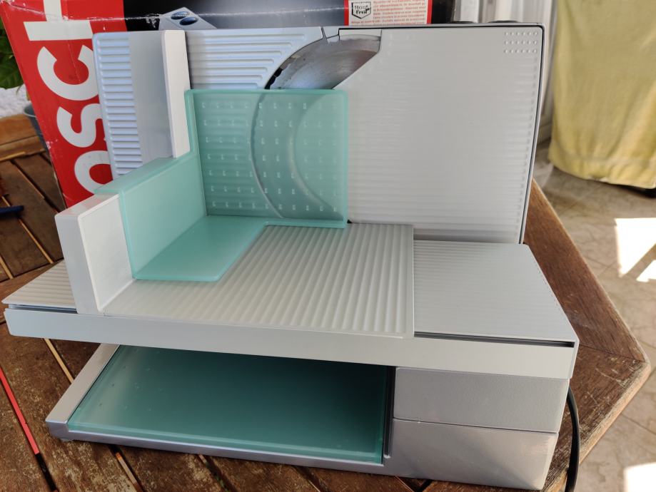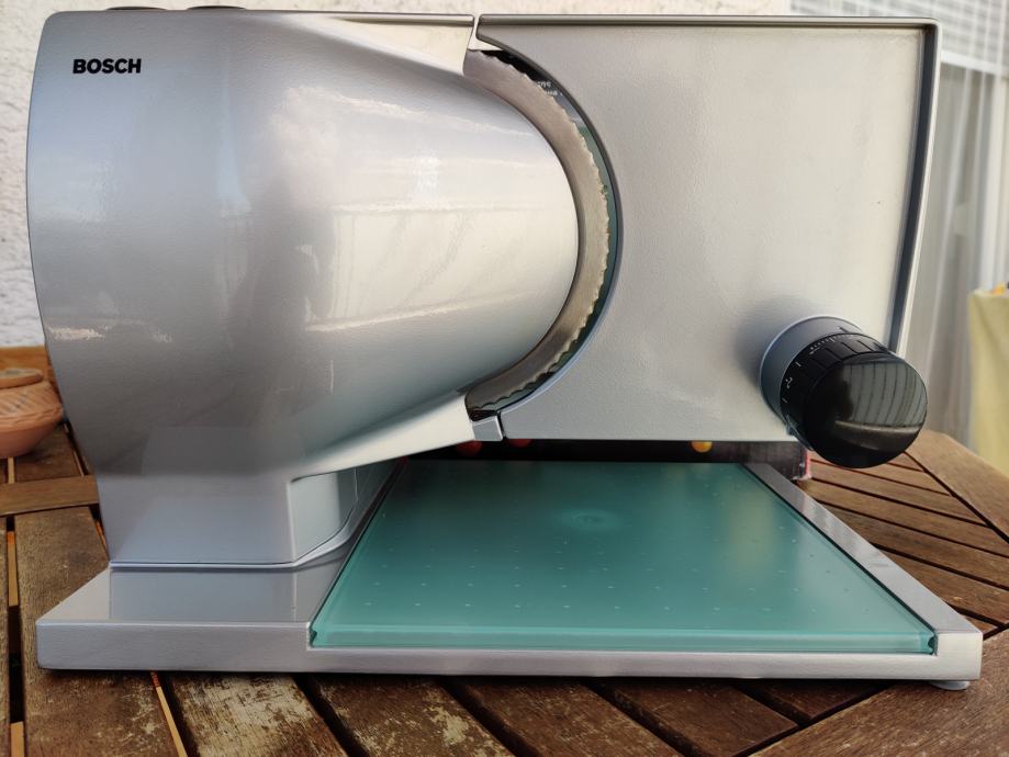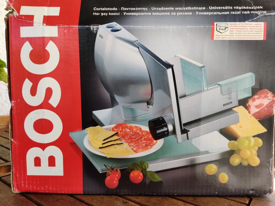 Univerzalna rezalica / salamoreznica Bosch MAS9101N, malo korištena, u odličnom stanju. Nož (Solingen) od nehrđajućeg čelika kao novi. Snažni motor od 140W reže od najtvrđega pršuta do svježeg kruha. Moderan dizajn s aluminijskim izgledom.
