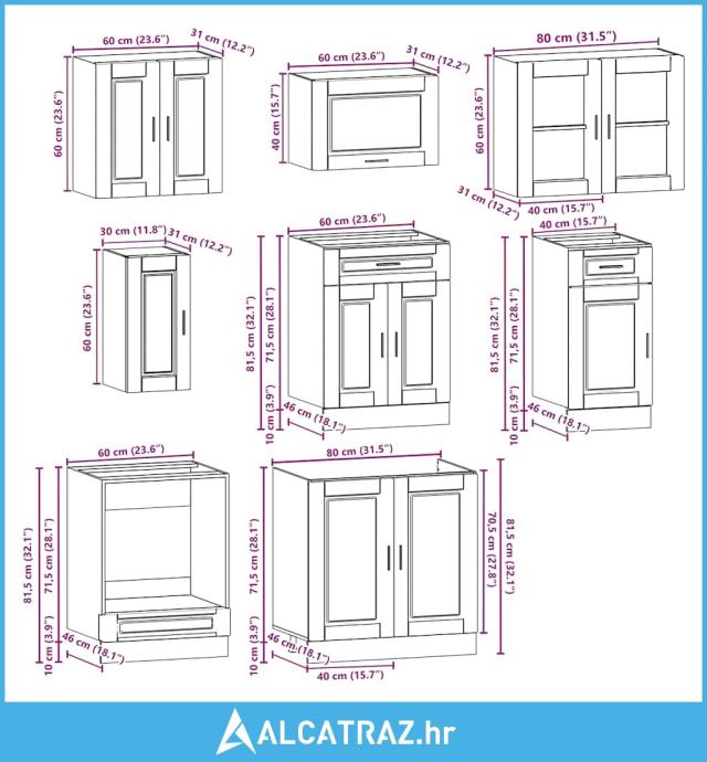 - 1 x ormarić za pećnicu: 60 x 46 x 81,5 cm (Š x D x V)