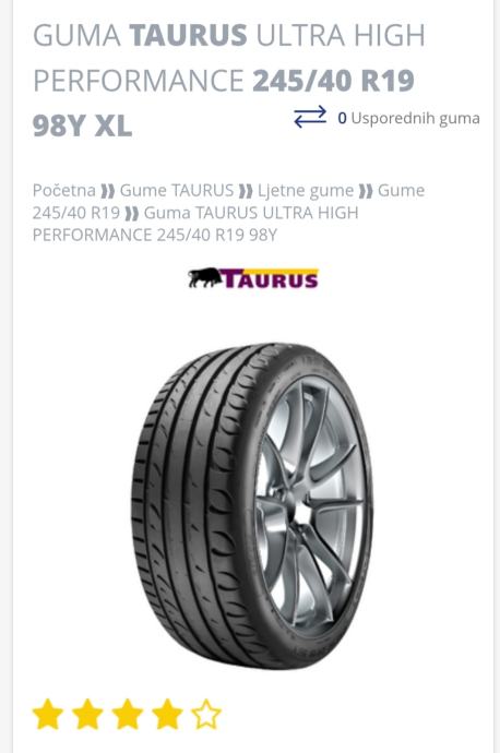 Taurus Ultra High Performance je guma ultra visokih performansi, pogodna za snažne automobile, sportske automobile, crossovere i SUV-ove. Kruti i asimetrični uzorak gaznoga sloja pruža izvrsnu kontrolu vozila, čak i pri velikim brzinama. Nova gumena smjesa na bazi silicija i njezini duboki utori optimiziraju prianjanje na mokrim ili suhim površinama.