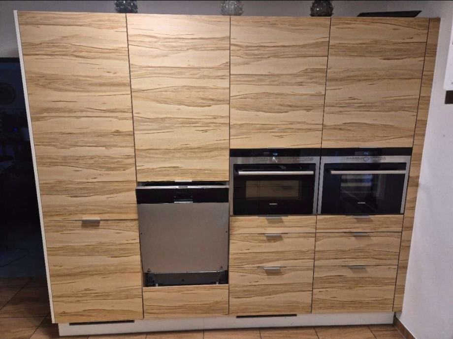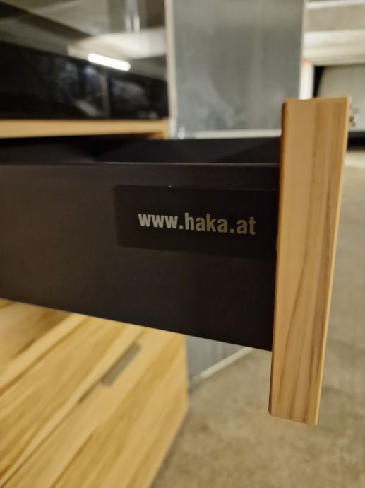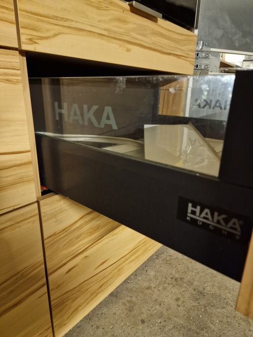 Na prodaju je visokokvalitetni blok visokih elemenata austrijske premium marke HAKA. Kuhinja oduševljava svojim izraženim izgledom drveta (dekor srži jasena / Kernesche) s vodoravnim godovima, što stvara toplu i modernu atmosferu u domu.