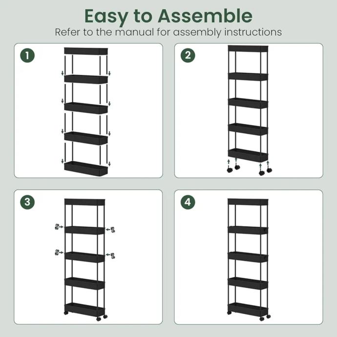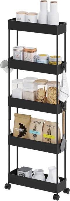 Kolica za posluživanje s 5 razina, uska kolica na kotačiće, kuhinjska kolica s kotačićima, kolica za nišu s izdubljenim košarama, polica na kotačiće za kuhinju, dnevni boravak, kupaonicu, izrađena od plastike, crna