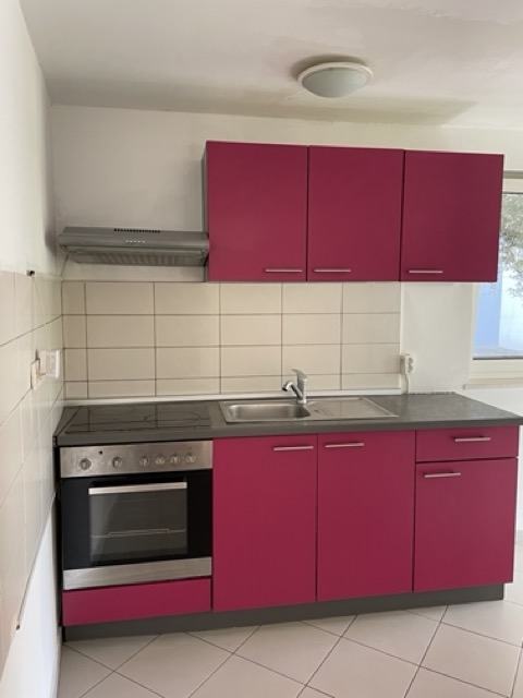 Kuhinja ukupne širine 2 metra, boja siva i magenta. Radna ploča laminat siva.