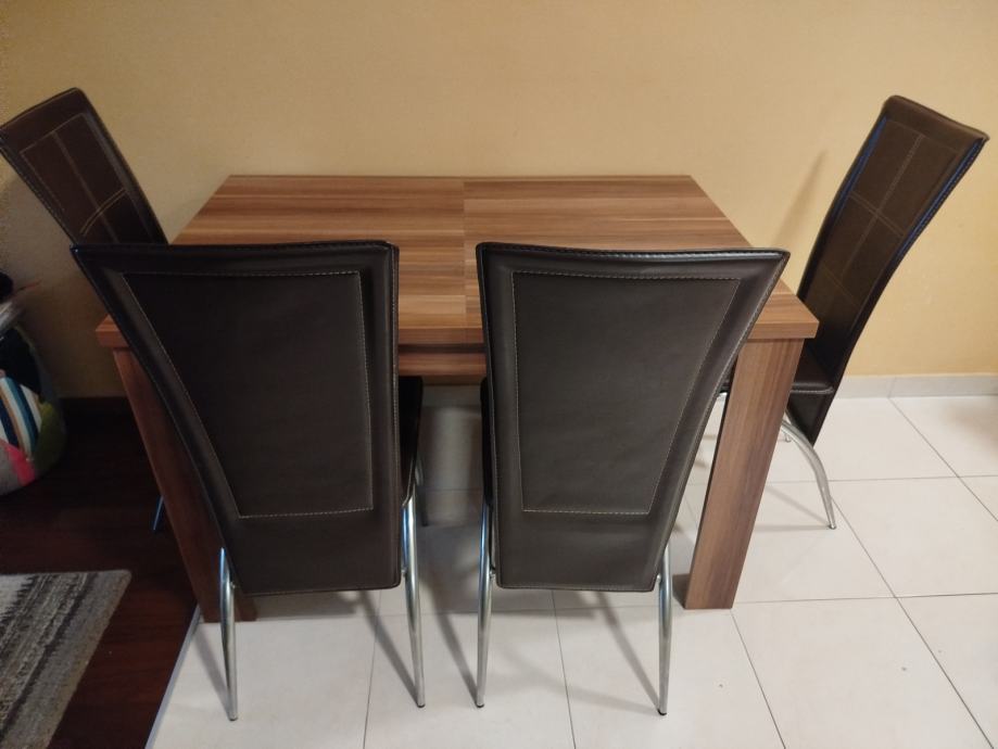 Drveni stol ( sa mogucnost prosirenja za 8 osoba) + 4 stolica ( smedja koza).