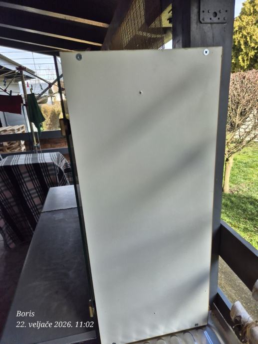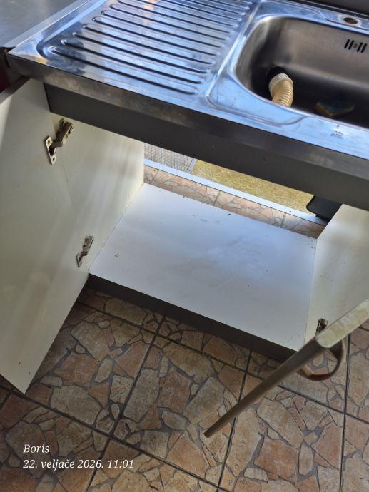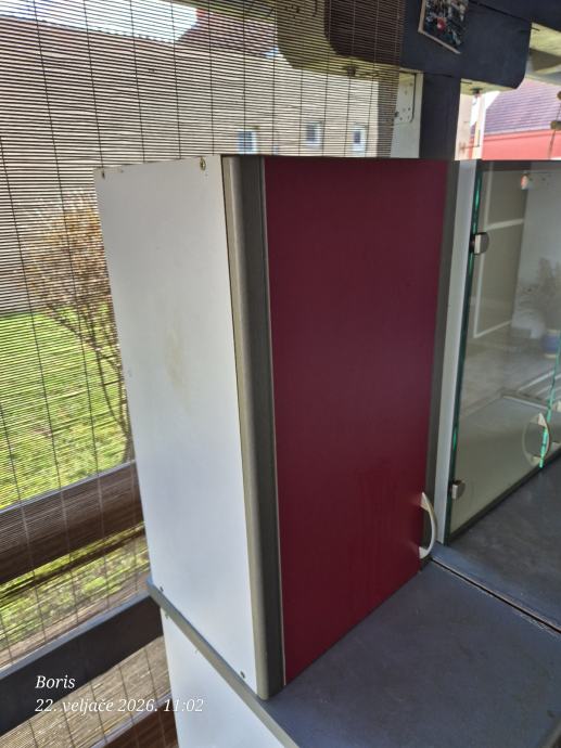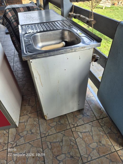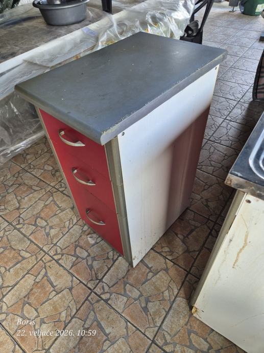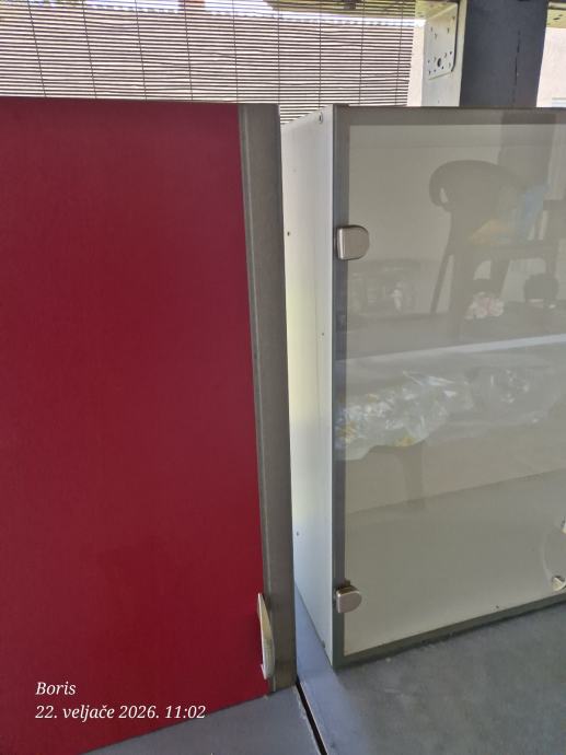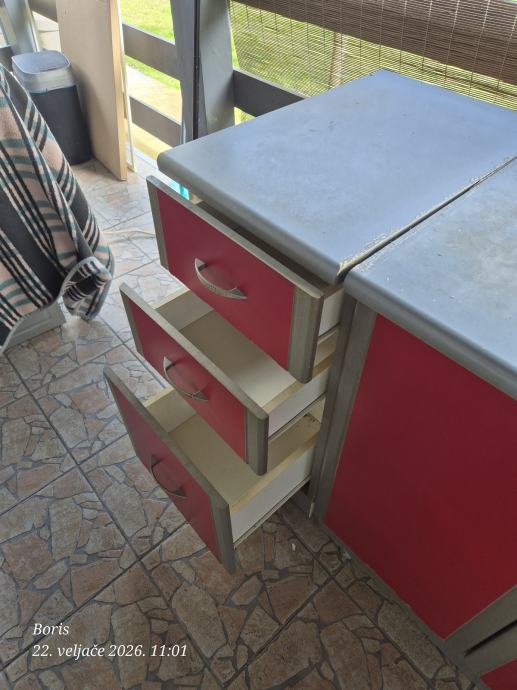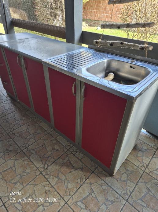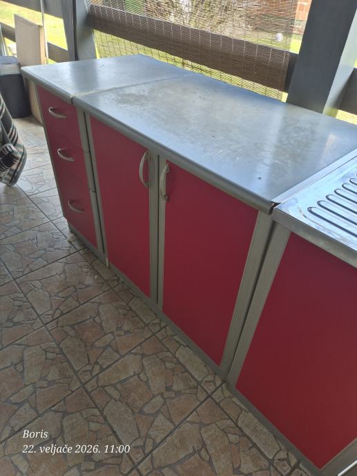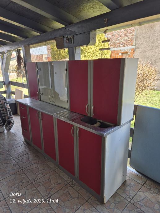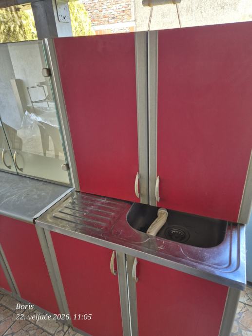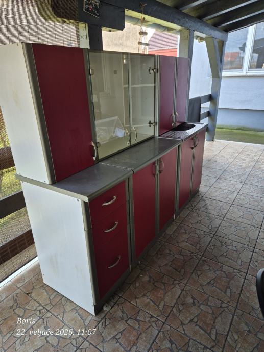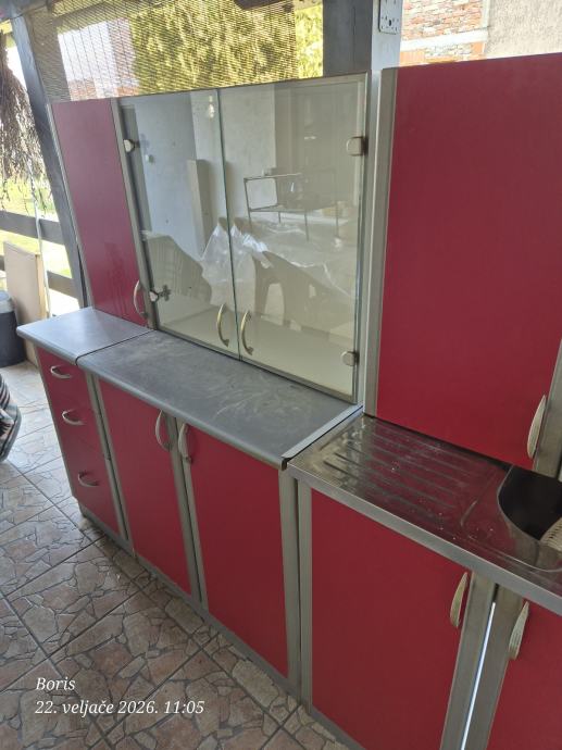 Prodajem kuhinjski blok ukupne širine 200 cm s ugrađenom sudoperom. Komplet se sastoji od donjih i gornjih ormarića, pri čemu gornji dio ima staklena vrata. Frontovi su crvene boje s aluminijskim okvirima i ručkicama, a donji dio uključuje i ladice za odlaganje. Sudopera je od nehrđajućeg čelika i smještena je u krajnjem dijelu radne ploče.
