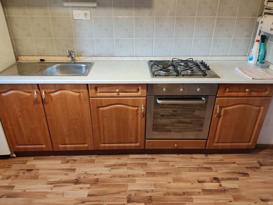 Prodaje se komplet kuhinja sa svim elementima i radnom plocom duzine 250 cm na slici te s ispravnom plinskom plocom za kuhanje,pecnicom i sudoperom. Dimenzije gornjih elemenata 80x50x50,dimenzije donjih elemenata 80x50x60x50. Kuhinja je koristena godinu dana te vec par godina stoji neupotrebljena. Kuhinja je rasklopljena te sama demontaza od strane kuoca nije potrebna. Moguce je provjeriti stanje kuhinje prije kupnje.