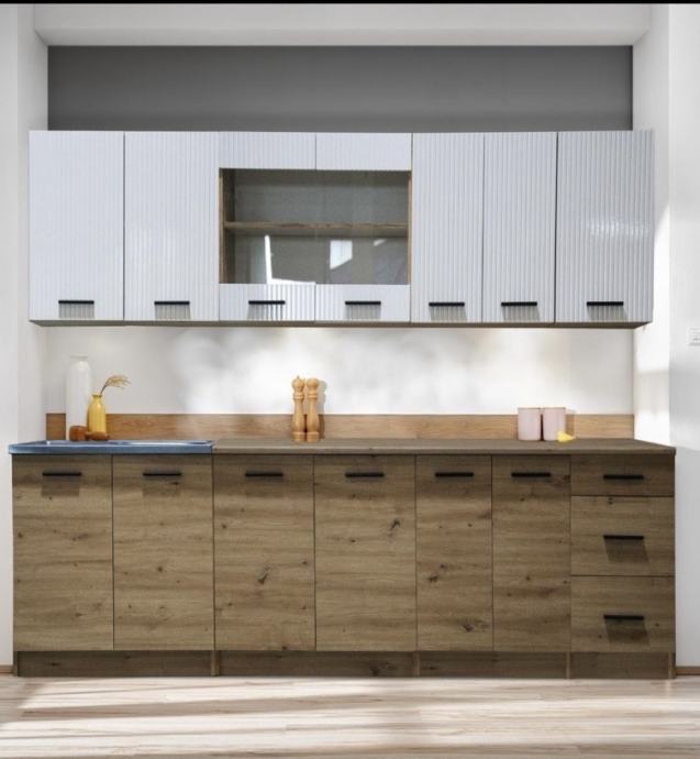 Blok kuhinja dužine 2,40m sa radnom pločom Novo u paketima.Gornji ormarići reljefni.