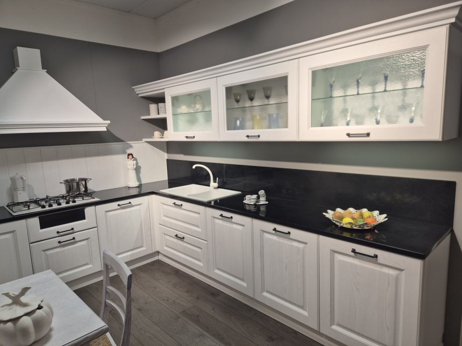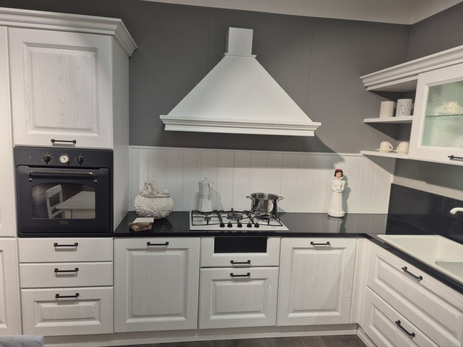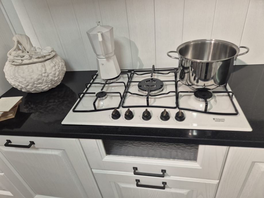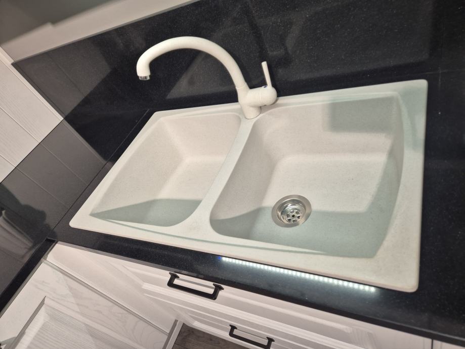Kuhinja ima drvene fronte od jasena lakirane u bijelu boju..Sva je u potpunosti nova te nekorištena..samo izložena za vidjeti te se prodaje takva kakva je na slici ..sa svim mogućim aparatima. Hoadnja .ndoa.sudooer špina mašina štednjak pećnica...radna ploča je crni granit...zbog mijenjanja asortimana prodaje se kuhinja...za mjere slobodno pitajte..ali kuhinja je velika kao što vidite