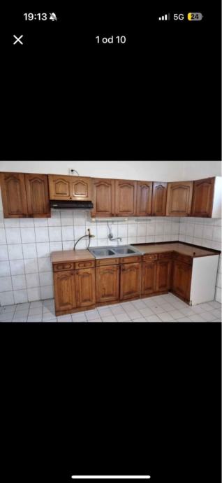 Komplet kuhinja, fronte od hrasta, iveral u losijem stanju, kuhinja je za renovaciju, napa i sudoper idu uz kuhinju, imam još jedan elemet od nje što nije na slici (donji element). Cijena za sve samo 100€.